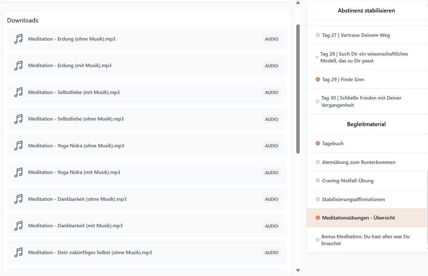 Die Meditationen und Stabilisierungsaffirmationen findest Du im Programmbereich unter "Begleitmaterial"- "Meditationsübungen". Klick dazu im ersten Schritt links in der Leiste auf "Programme" und anschließend auf die Kachel des Programms "Abstinenz stabilisieren mit Nathalie". Wenn Du in der rechten Leiste runterscrollst, siehst Du die Übersicht unter den "Begleitmaterialien":